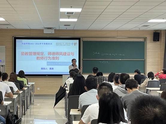 副经理黄涛教授详细解读了《伟德国际bevictor1946课程助教管理规定》,明确了助教的岗位职责,并指导全体助教学习了《新时代高校教师职业行为十项准则》、《伟德国际bevictor1946教师思想政治工作与师德师风建设方案》,特别强调助教要自觉加强师德修养,严格遵守师德规范。