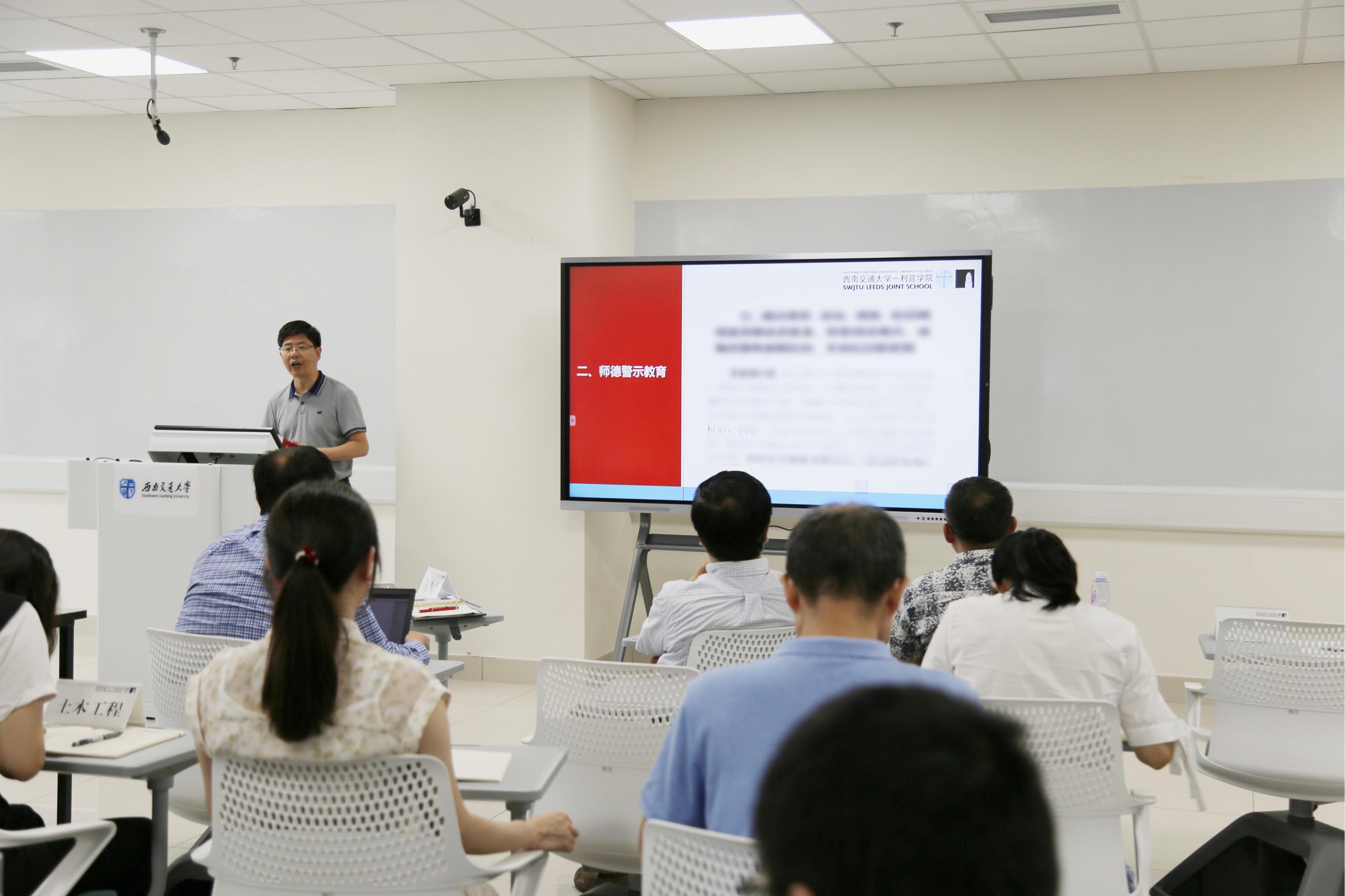 江久文书记传达了教育部和公司关于开展师德教育的相关精神,领学《新时代高校教师职业行为十项准则》,结合师德师风警示案例强调全体教职工要遵循新时代师德规范,真正做到“树人先树己、教书又育人”。