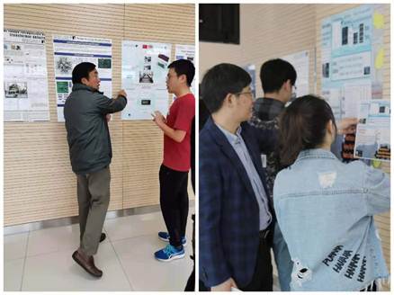 同学们早早来到教室,展示自己精心准备的作品。共有66张海报、若干实物模型和视频作品接受展览与评判。同学们全程英文展演讲解,评审老师一对一提问指导,同学之间自由观摩交流学习。会场学术氛围浓厚,精彩纷呈。