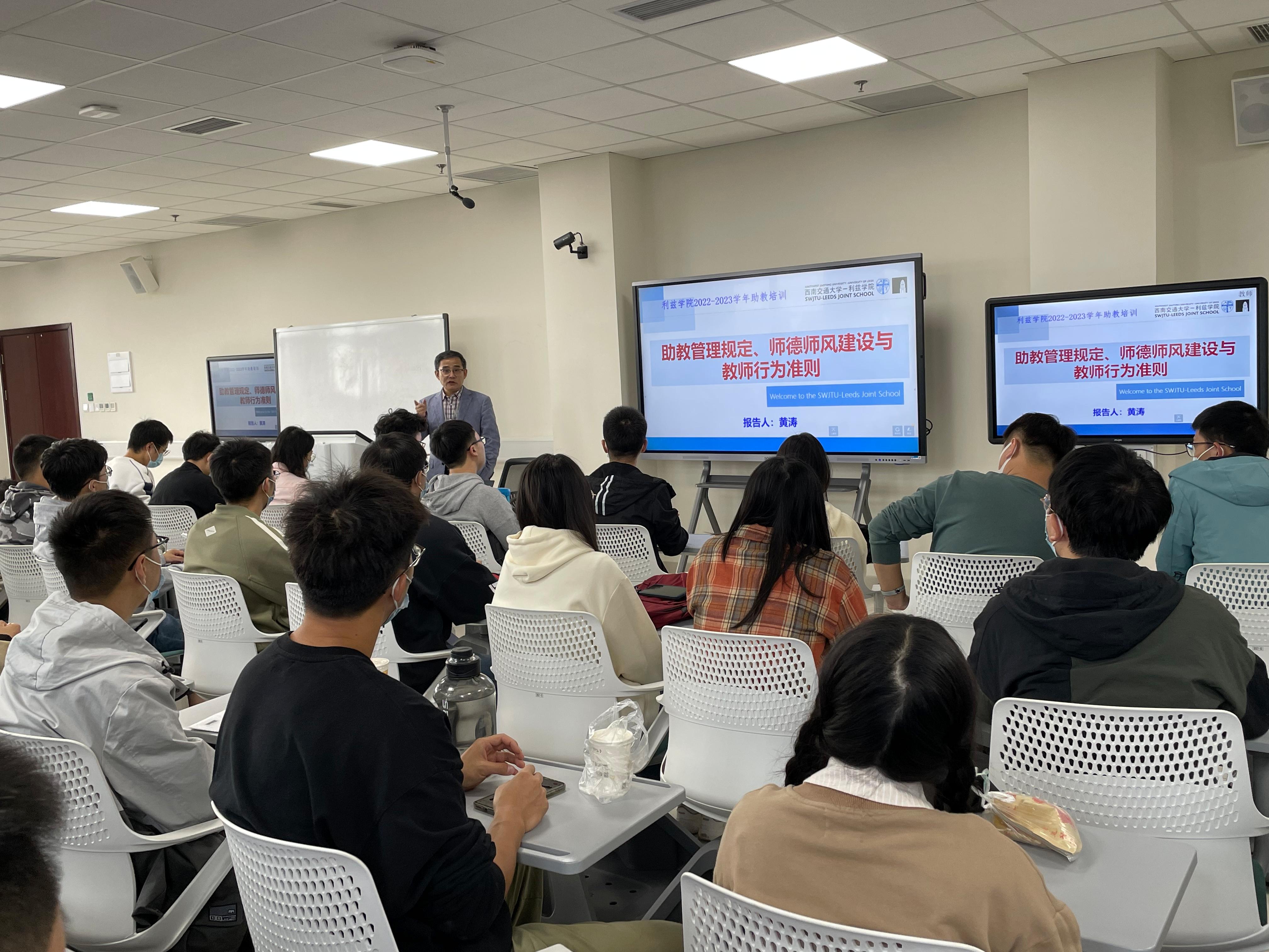 副经理黄涛详细解读了《伟德国际bevictor1946课程助教管理规定》,明确了助教的岗位职责,并指导全体助教学习了《新时代高校教师职业行为十项准则》、《伟德国际bevictor1946教师思想政治工作与师德师风建设方案》,强调助教应自觉加强师德修养,严格遵守师德规范。