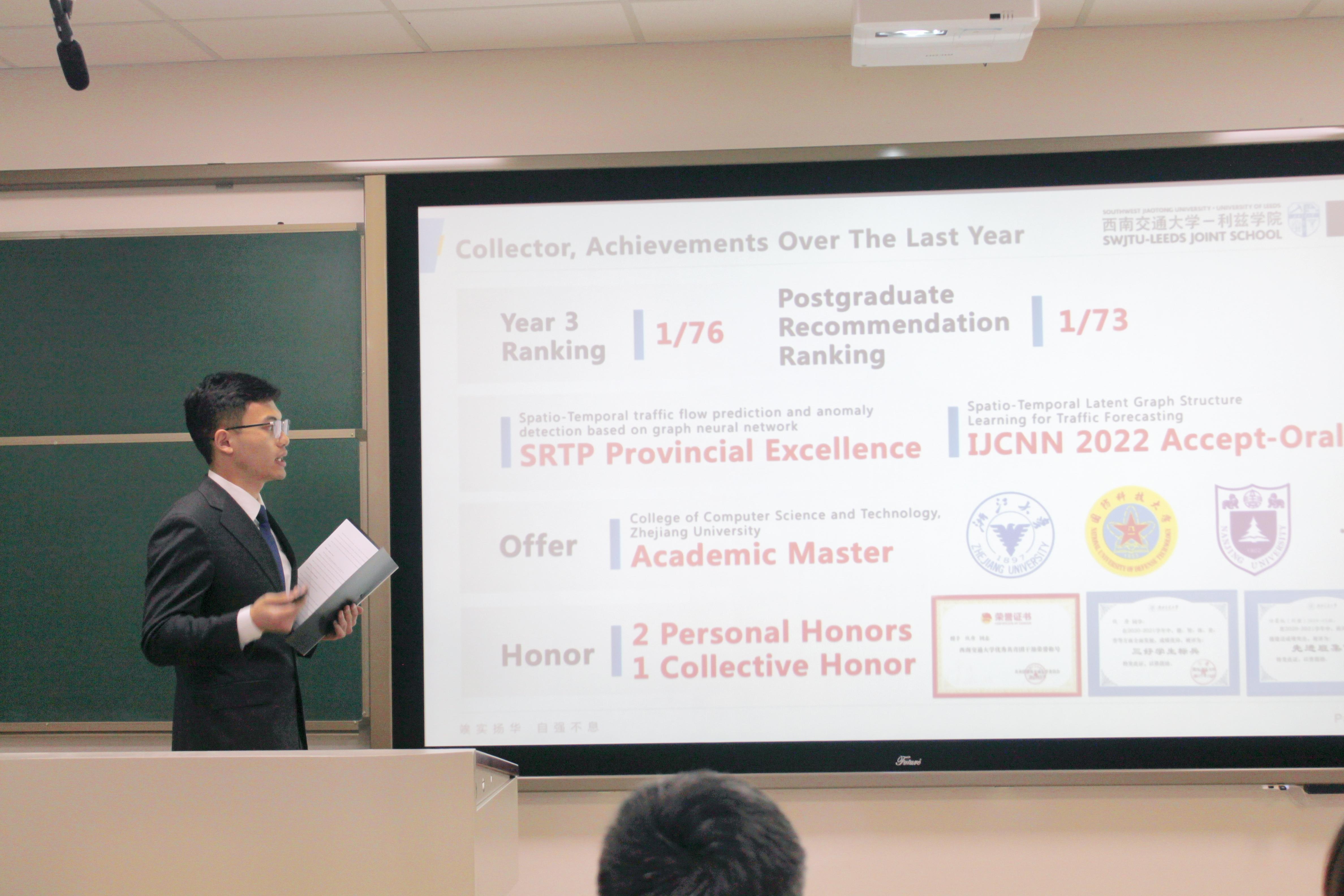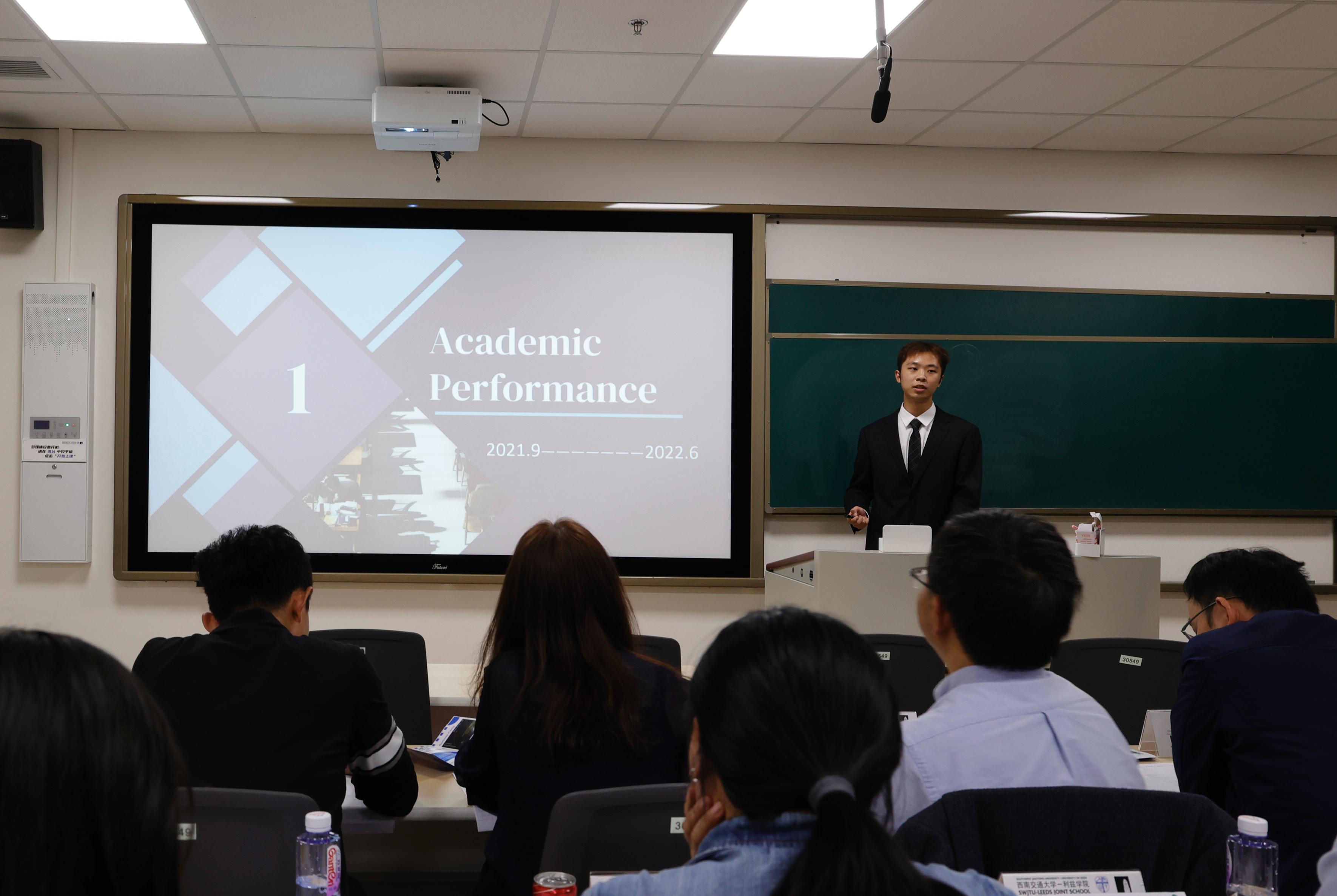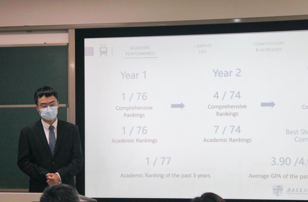 本次答辩采用全英文交流,突出国际化办学特色,答辩人从学习成绩、科创竞赛、社会实践和文体活动等方面展开自我介绍,他们突出的表现给现场师生留下了深刻印象:热爱祖国、服务班级;勤奋好学、成绩优异;投身科创、成果丰硕;全面发展、综合素质突出。