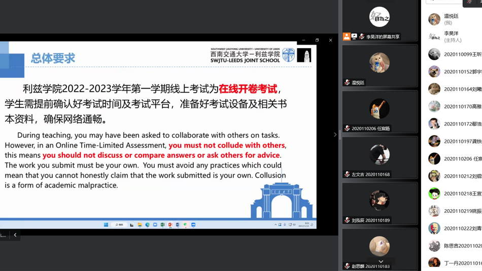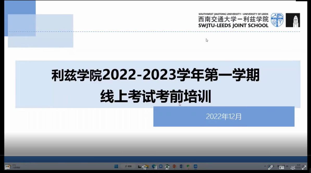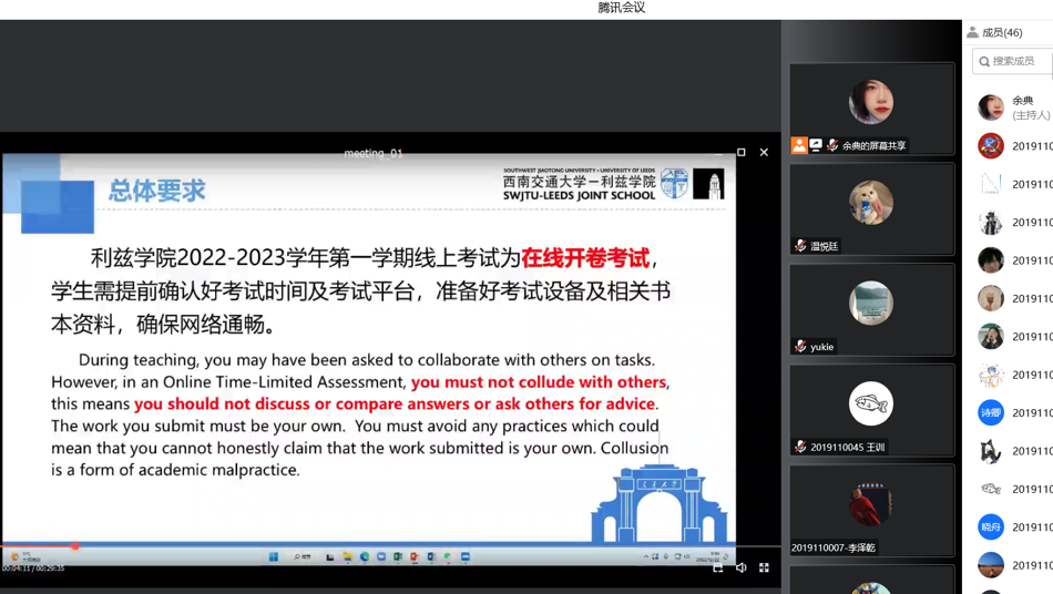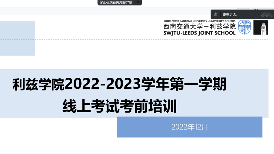 为促进公司学风建设、强化考风考纪教育、营造诚信应考氛围,2022年12月,伟德国际bevictor1946开展“2022-2023学年第一学期期末线上考试考前培训”, 32个班级陆续在线参加。本次培训由公司副经理黄涛主讲,各班级辅导员主持,全体员工参加。
