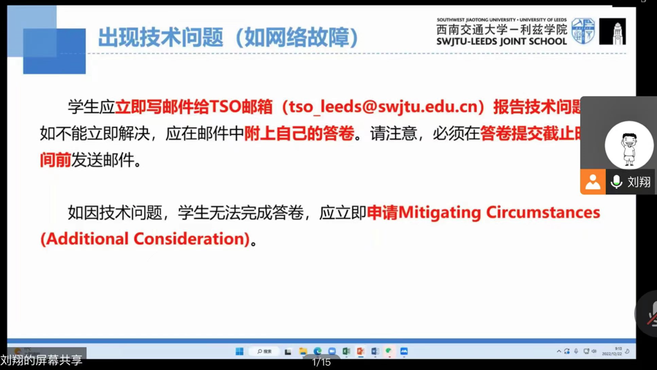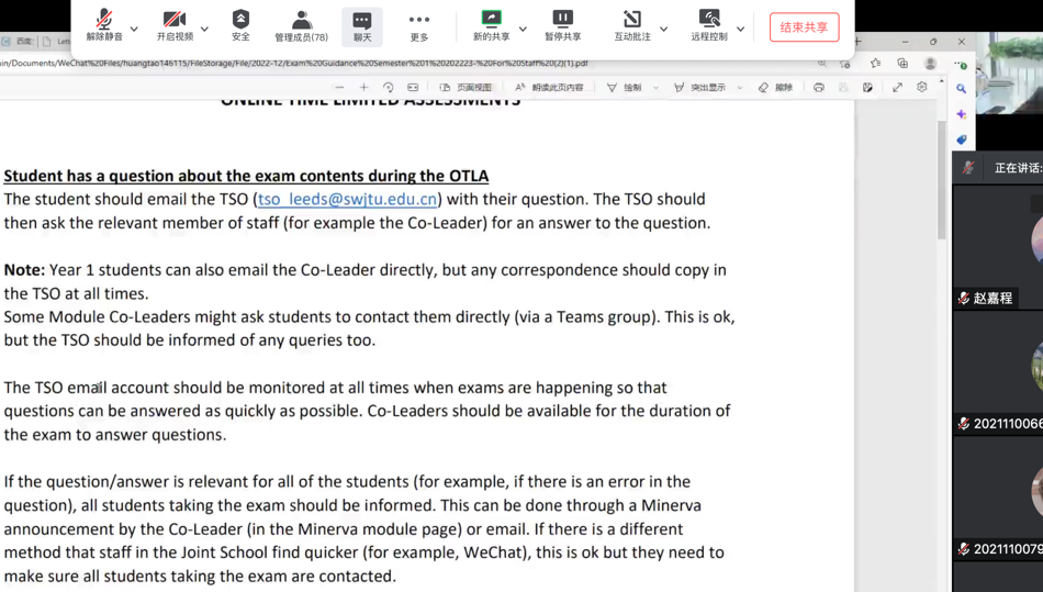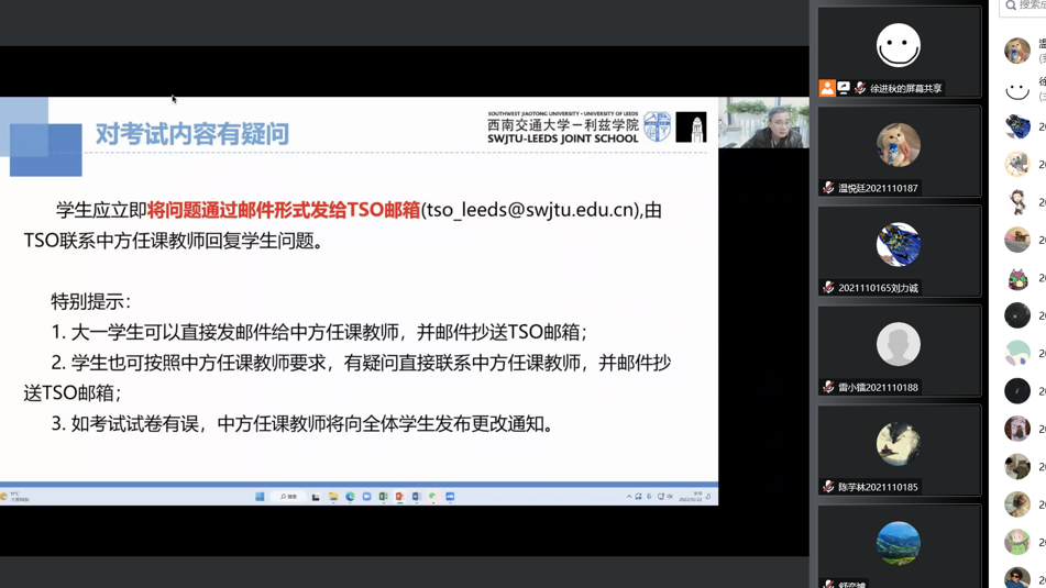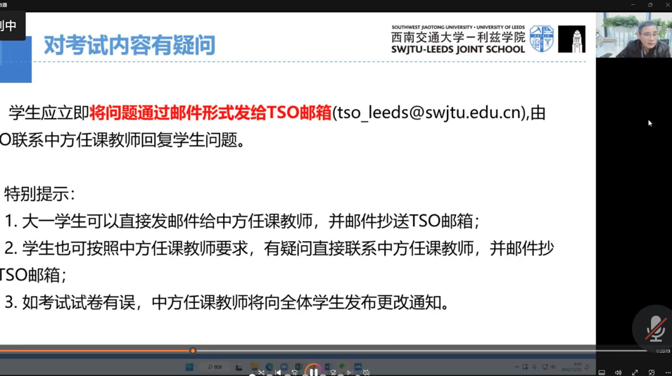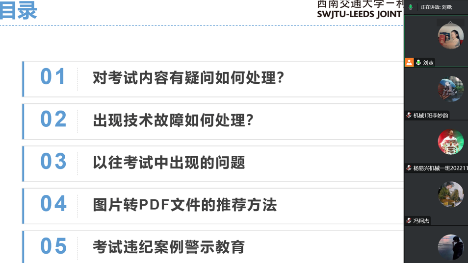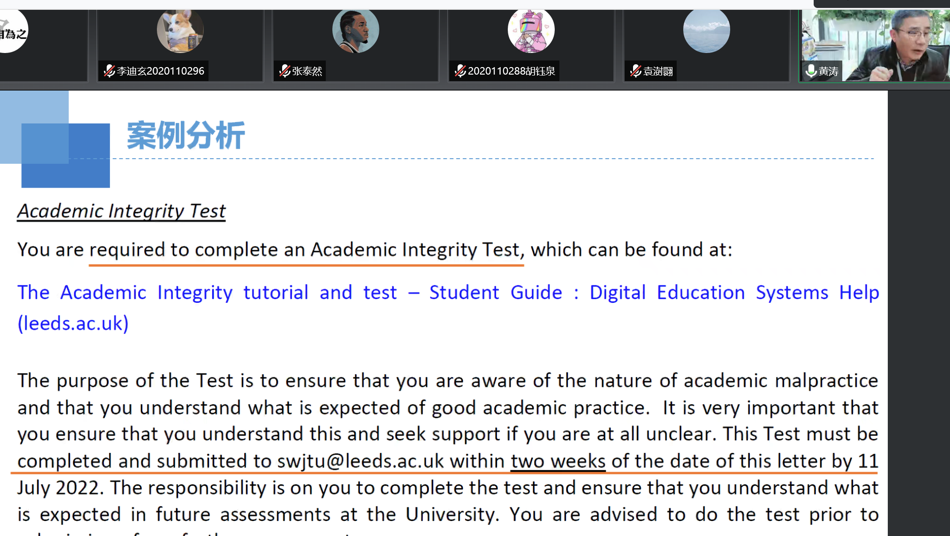 黄涛从“对考试内容有疑问怎么处理”、“出现技术故障如何处理“、”以往考试中出现的问题“、”图片转PDF文件的推荐方法“、”考试违纪案例警示教育“等五个方面对期末线上考试进行详细介绍。黄涛通过案例分析,特别是通过因为学术不端造成严重后果的介绍,再次强调学术诚信的重要性,强化坚守学术诚信的意识。