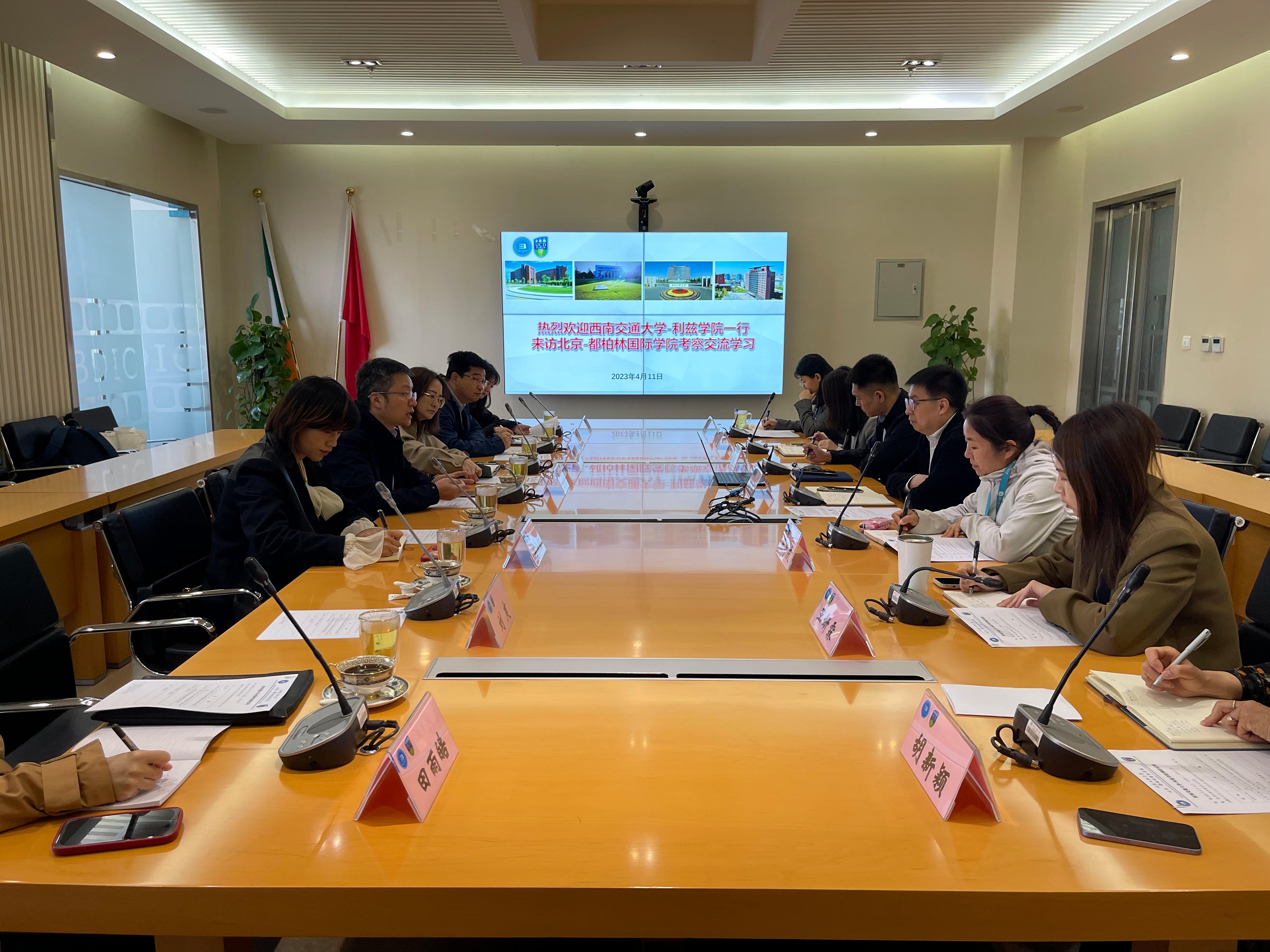 4月11日上午,伟德国际bevictor1946副经理赵舵、一年级中方负责人沈一新、综合事务中心主任王宇、员工支持中心副主任陆宇佳等一行赴北京工业大学北京-都柏林国际公司调研学习。北京-都柏林国际公司党委书记杨庆,党委副书记、副经理刘今朝以及公司相关人员出席本次会议。